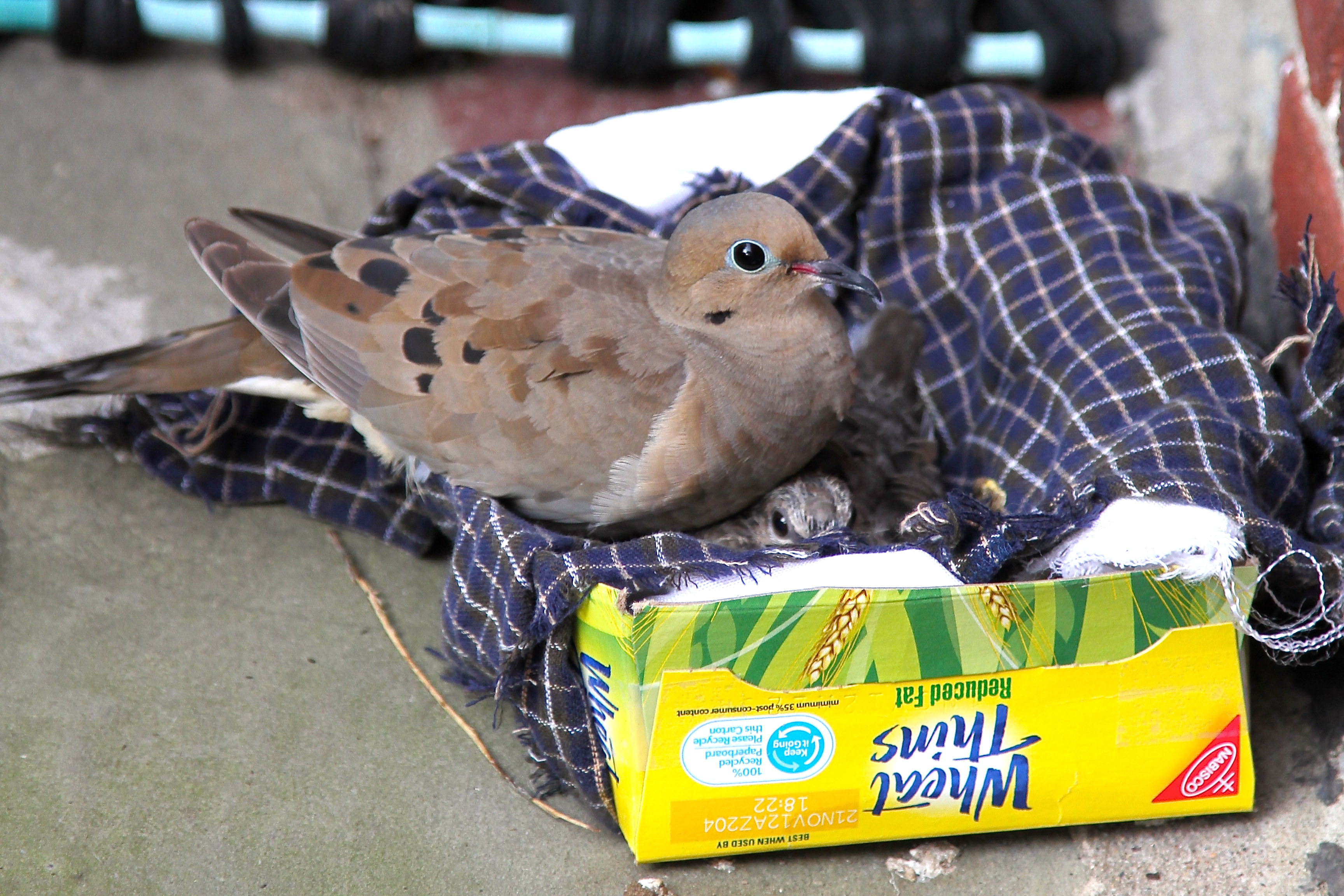 Doves, we were told by another expert, are notorious for building flimsy nests in less than ideal locations. It’s not uncommon for their nests to break apart or for their eggs, and babies, to tumble out. But despite such obstacles, or maybe because of them, mourning doves are also fiercely protective of their children. It’s just the way they are wired.
