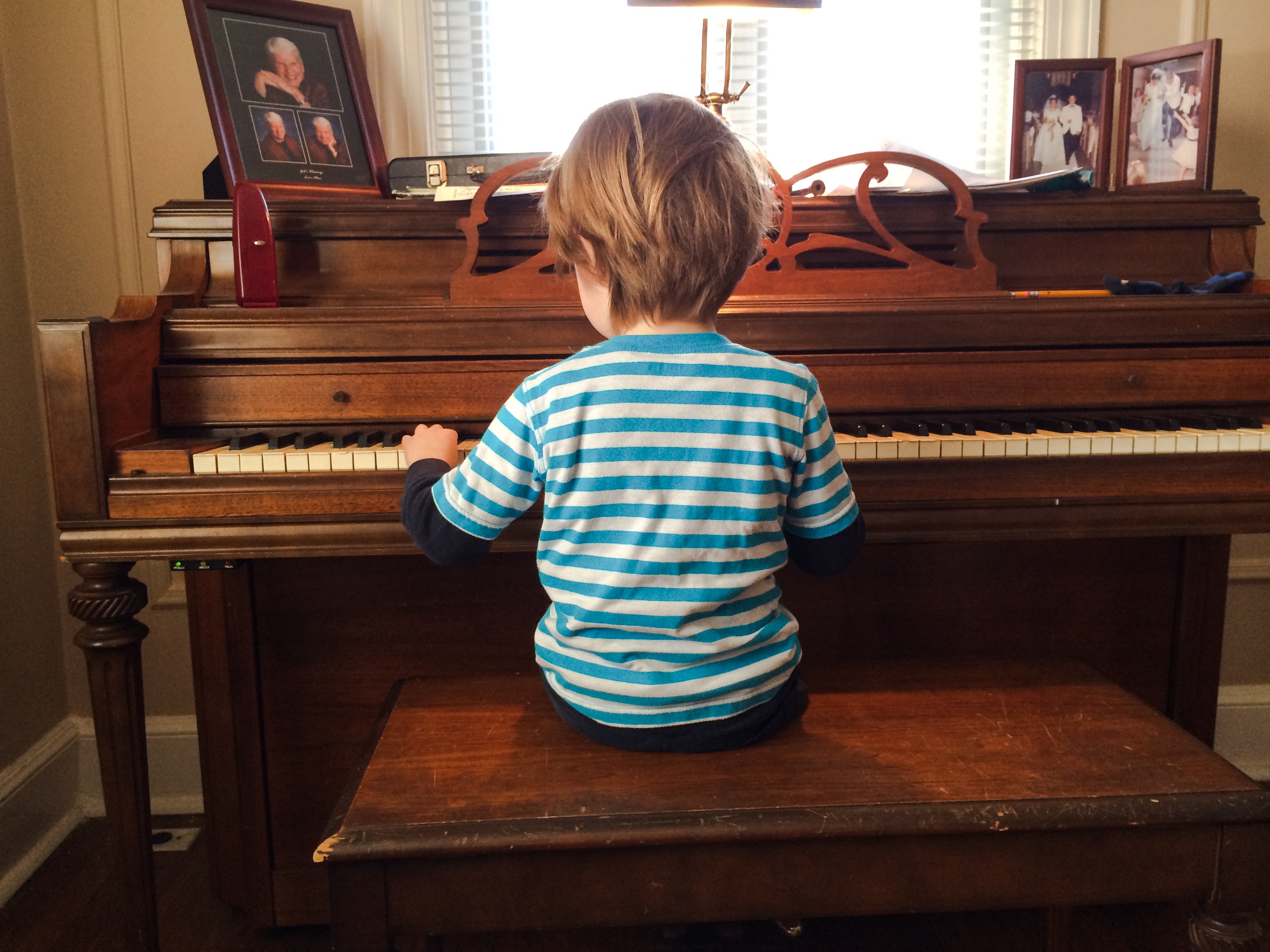 I love to listen to my boys play, too. I don’t even mind–because my grandmother would not have, either–that the keys of her pee-anna are often covered in their hand grub. They sit at that piano in their underwear, and their baseball uniforms, banging away at Mozart and Coldplay. Sometimes they’re happy and focused. Sometimes they’re weeping or furious. Sometimes they’re at the piano simply to escape something, or someone, in the house by drowning themselves in their music.