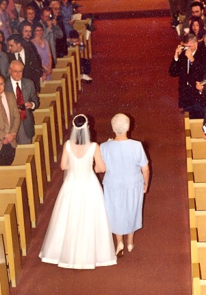 In one of his last parental acts, my father called a buddy who ran a local machine shop and arranged to have the metal hangers made for my decorations. I bought the paper and the ribbons, and though his fingers were fat with fluids, my father sat in his hospital bed and helped me fold the paper into cones. Later, after we had buried him, after I was back in Connecticut making final wedding preparations, I reminded my husband that we needed lily-of-the-valley for the cones. I had to have the lily-of-the-valley, even though it cost a fortune and he had to get up at the crack of dawn on the morning of our wedding to drive to a remote warehouse in northeast Philadelphia to buy them. Of course he got them. By the time my mother and I made our way down the aisle, though, our faces were tight and we could not take our eyes from the cross. I didn’t even notice the pew decorations. We had only made eight anyway, enough for the first four pews on each side. We ran out of time.